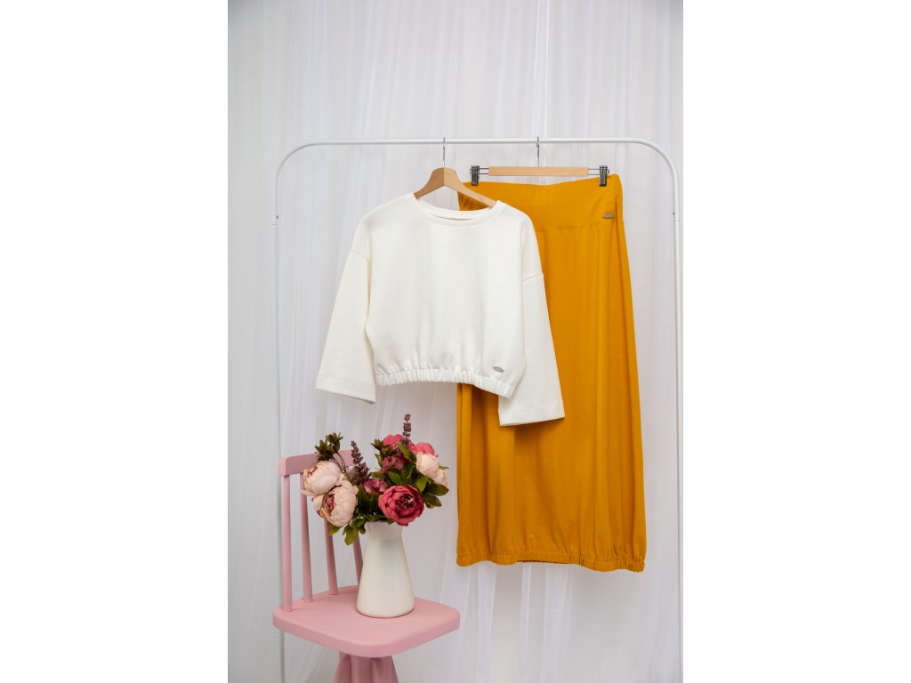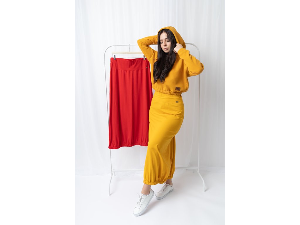 Vyšší pas a široká guma v pase nejenže skvěle padne a krásně stáhne bříško , ale také zajišťuje pohodlí po celý den. Lehký a vzdušný materiál vám umožní cítit se svobodně a elegantně zároveň. Střih do áčka zakončený řasením do úzké gumy.